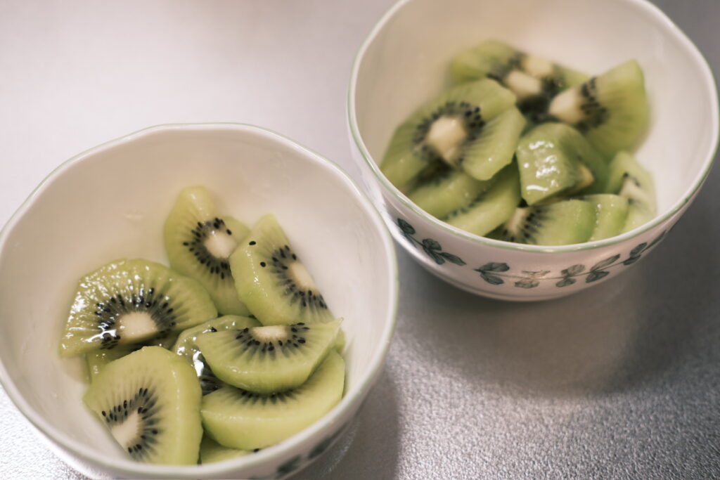 夕食のデザートは、カットしたキウイに先ほどのゆず蜜を和えて頂きました。キウイの酸味がゆず蜜の優しい甘さと合わさって、とっても美味しくて癒されるんです。
