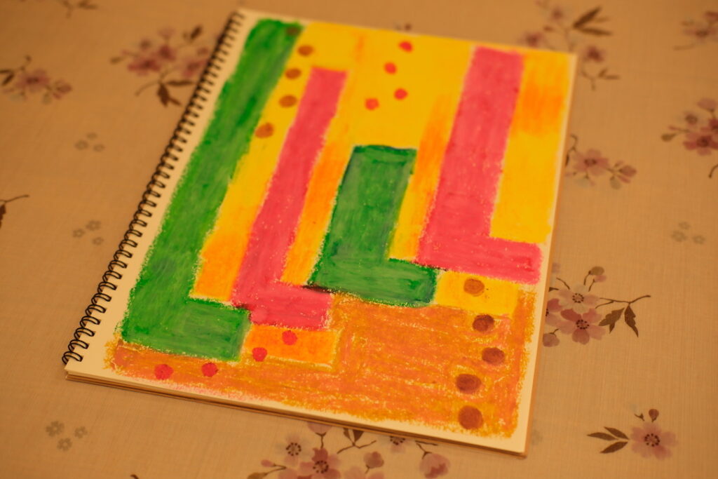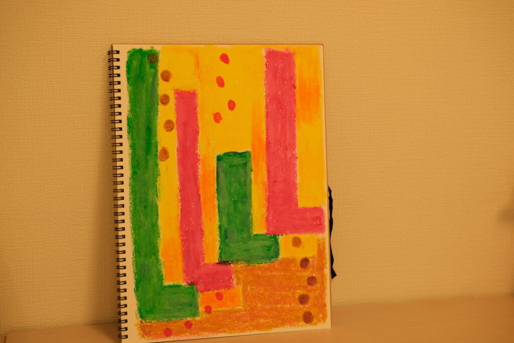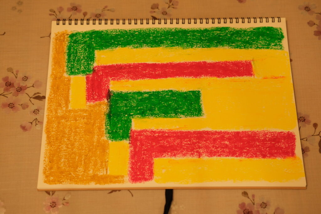 クリスマスっぽい絵を描こうと始めたものの「これを描こう」という目標も無いままスタート。クレパスを手に取り、好きな色で好きな線を引く。その行為が冒険のようで、黙々と集中する時間に吸い込まれていきました。