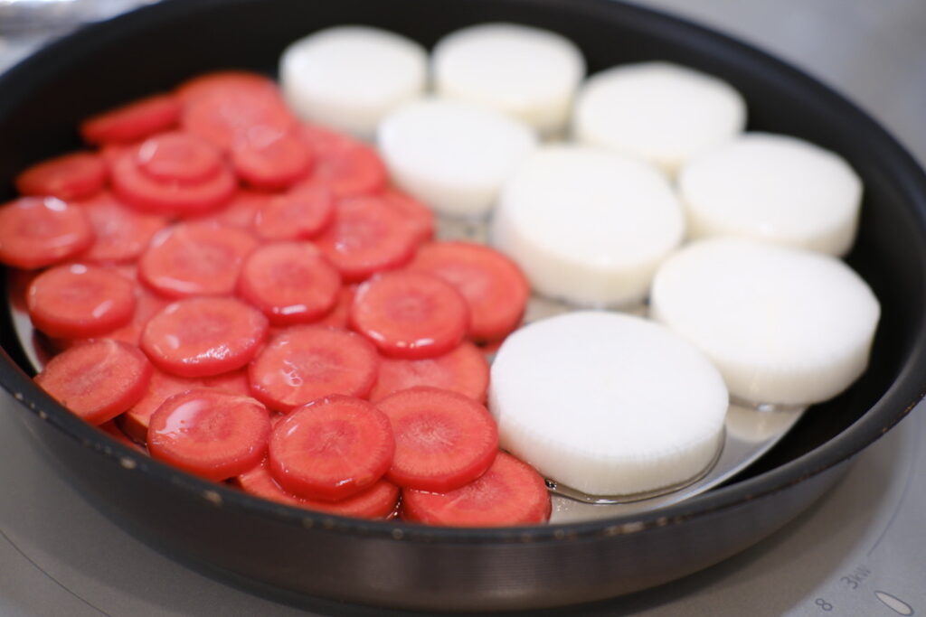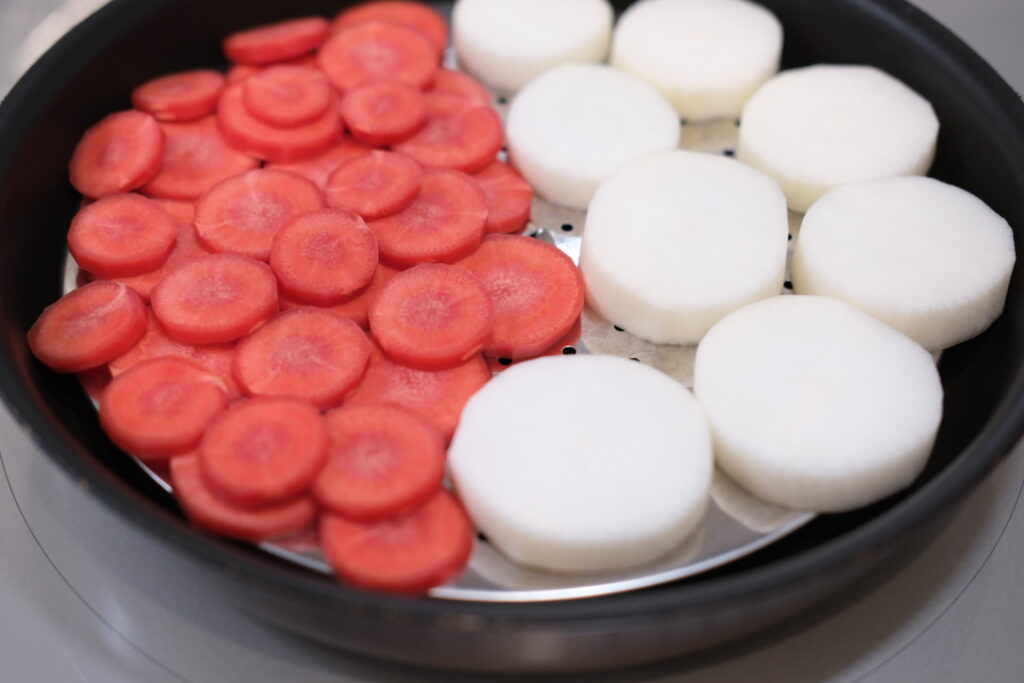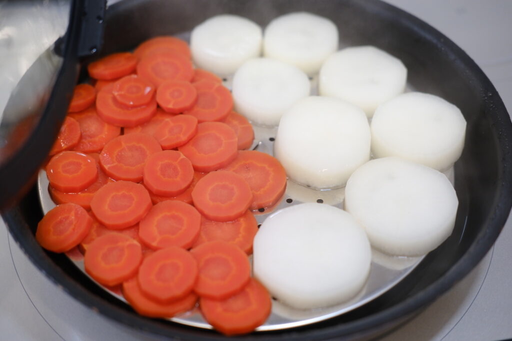 おめでたい感じがして、蒸す前から期待大。金時人参と大根を食べやすい大きさに切ってフライパンの蒸し皿に並べて、野菜の上に水をバァーッとかけます。