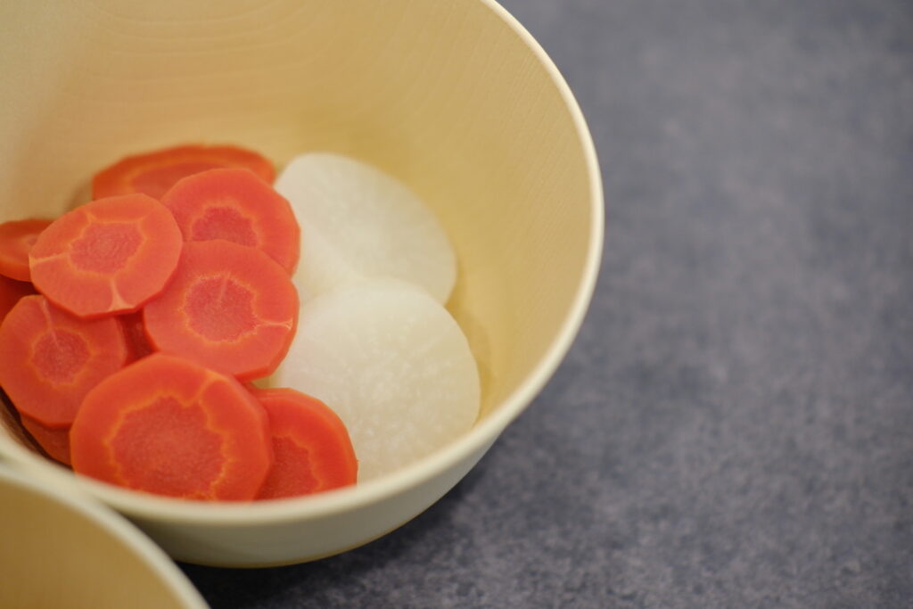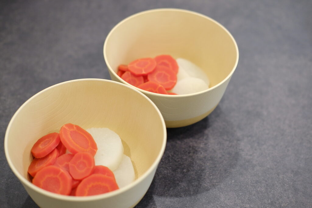 どんぶり椀に、蒸し上がった金時にんじんと大根を盛り付けます。