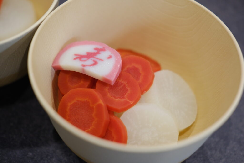 お雑煮は、お餅無し派の私達。紅白の野菜を具材にして「オリジナルお雑煮」にしようと、金時にんじんと大根をフライパンで蒸しました。