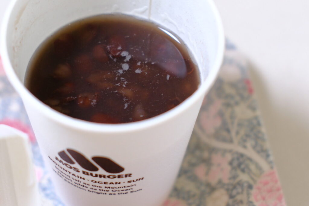 こちらは、ドリンクのカップに入ったおしるこ。小さなお餅が2個入っています。飲み物は自宅の温かい麦茶で。