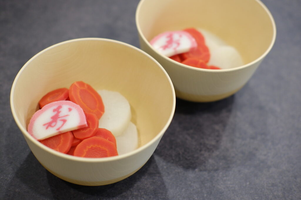 寿の蒲鉾をのせて、出来上がり。翌日に頂くため、ラップをして冷蔵庫へ。