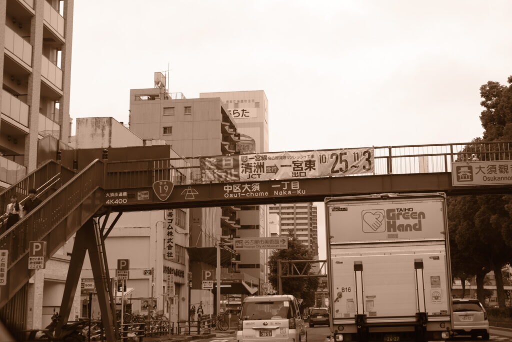 助手席から撮れた、大須の歩道橋。この歩道橋の色は、大須観音の朱色と同じになっています。