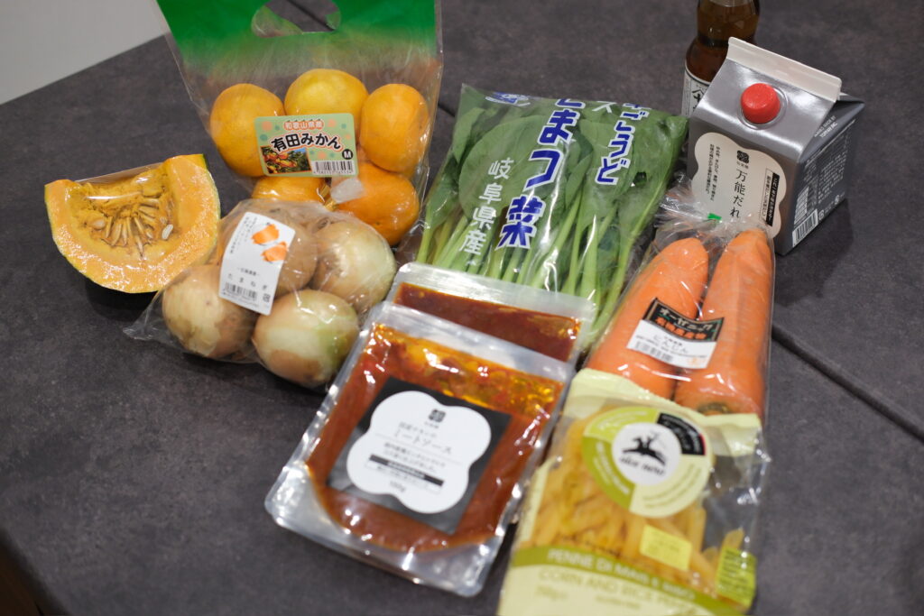 野菜、果物、調味料、パスタ、ミートソース…