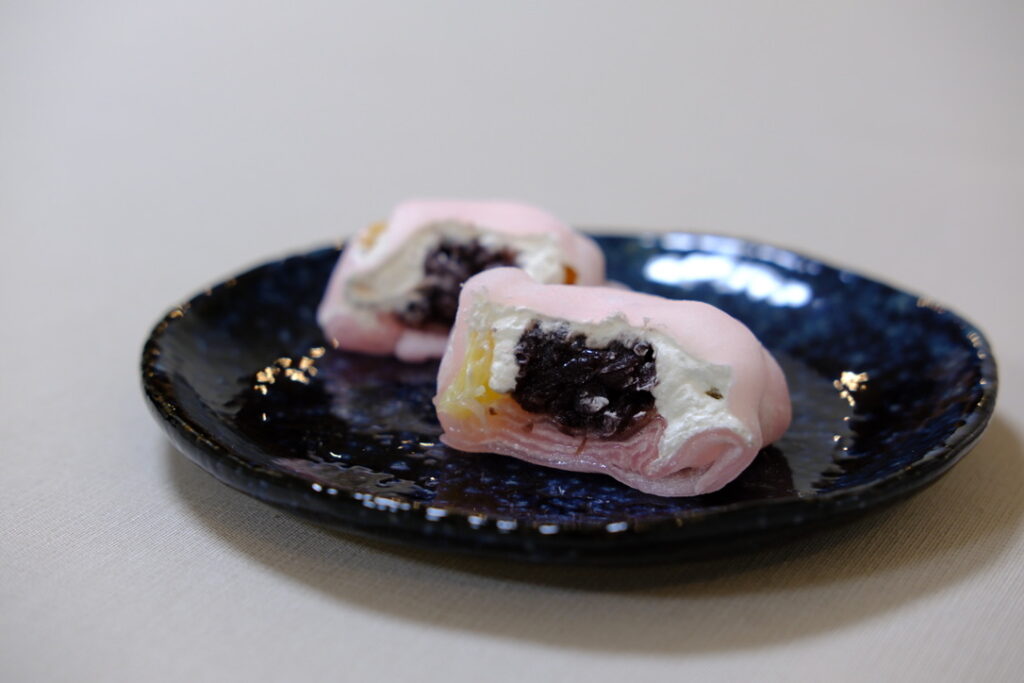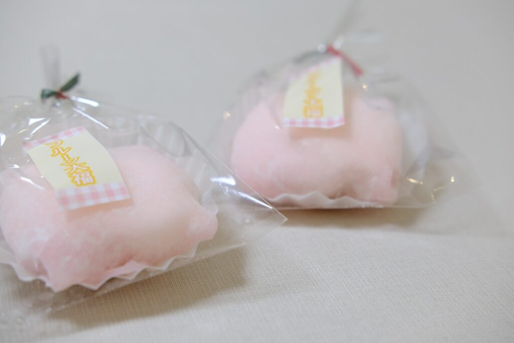 解凍したフルーツ大福。可愛いピンク色のお餅で、美しく折り畳まれていました…!