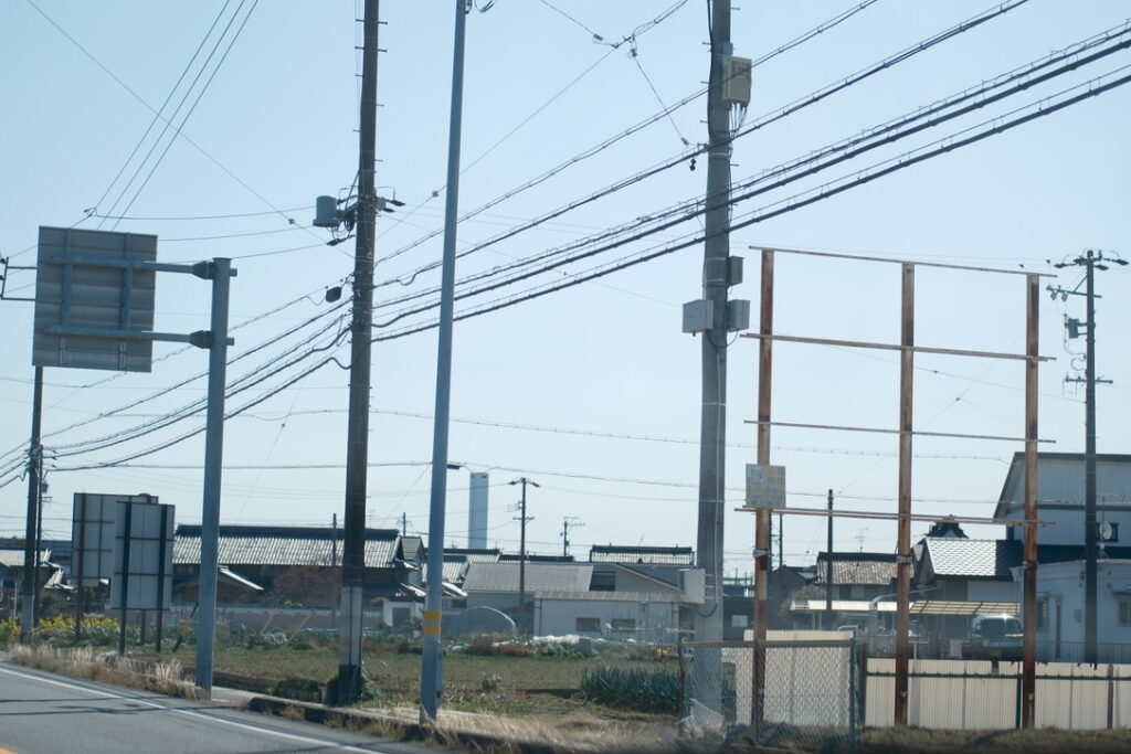 電柱や柱がたくさんある中で見える、タワーのような建物。私の中では稲沢市のシンボルのように思っています。