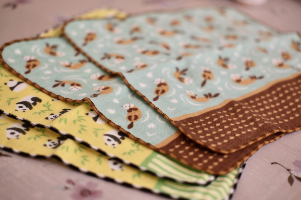 ラッコ柄は水色と茶色で無難だし可愛いですね。町娘のハンカチーフシリーズは、1枚550円なんです。生地も良いし「2種類買おっか!」と勢いが付きました。